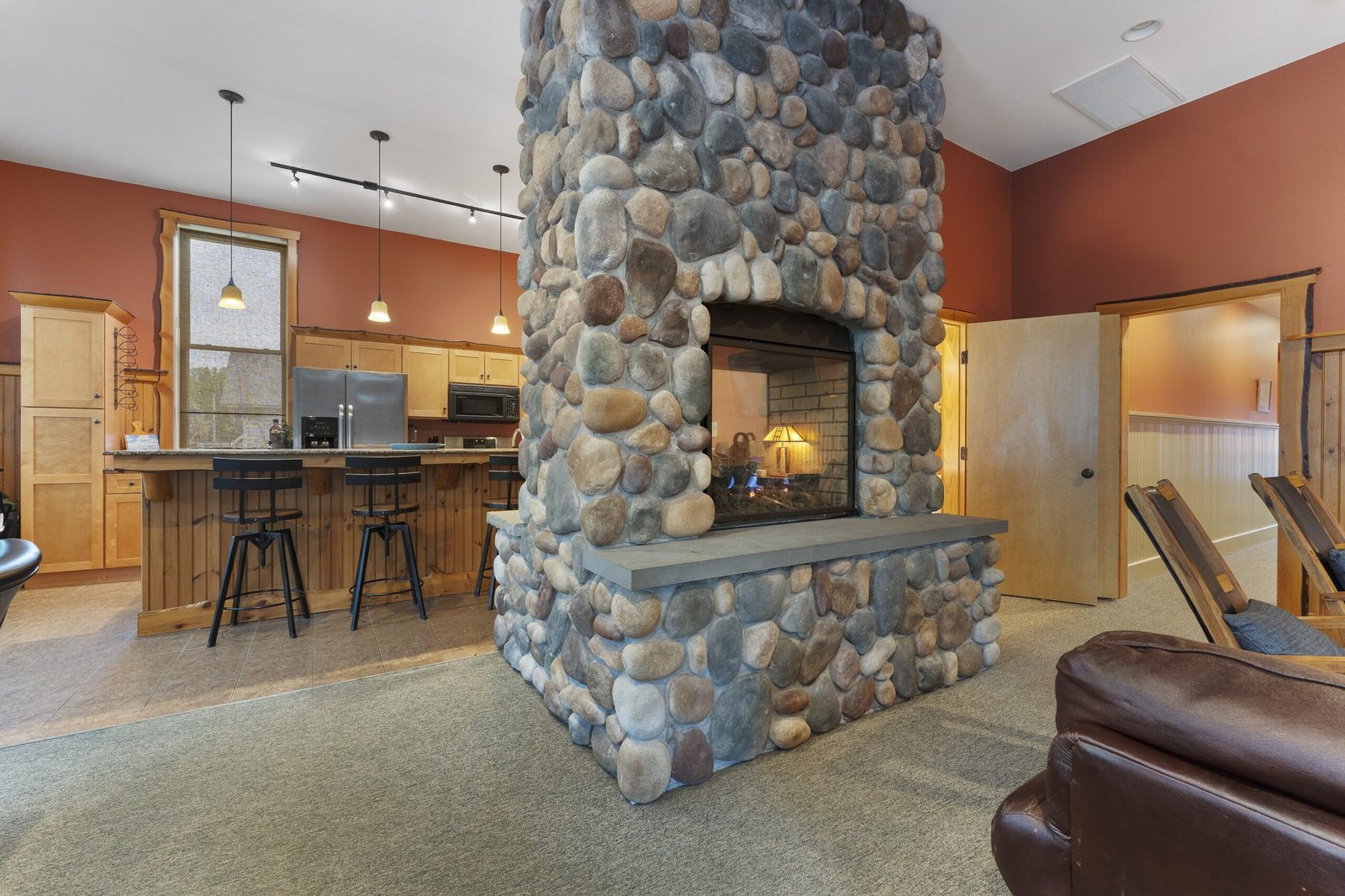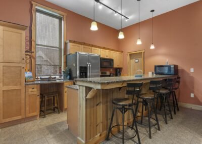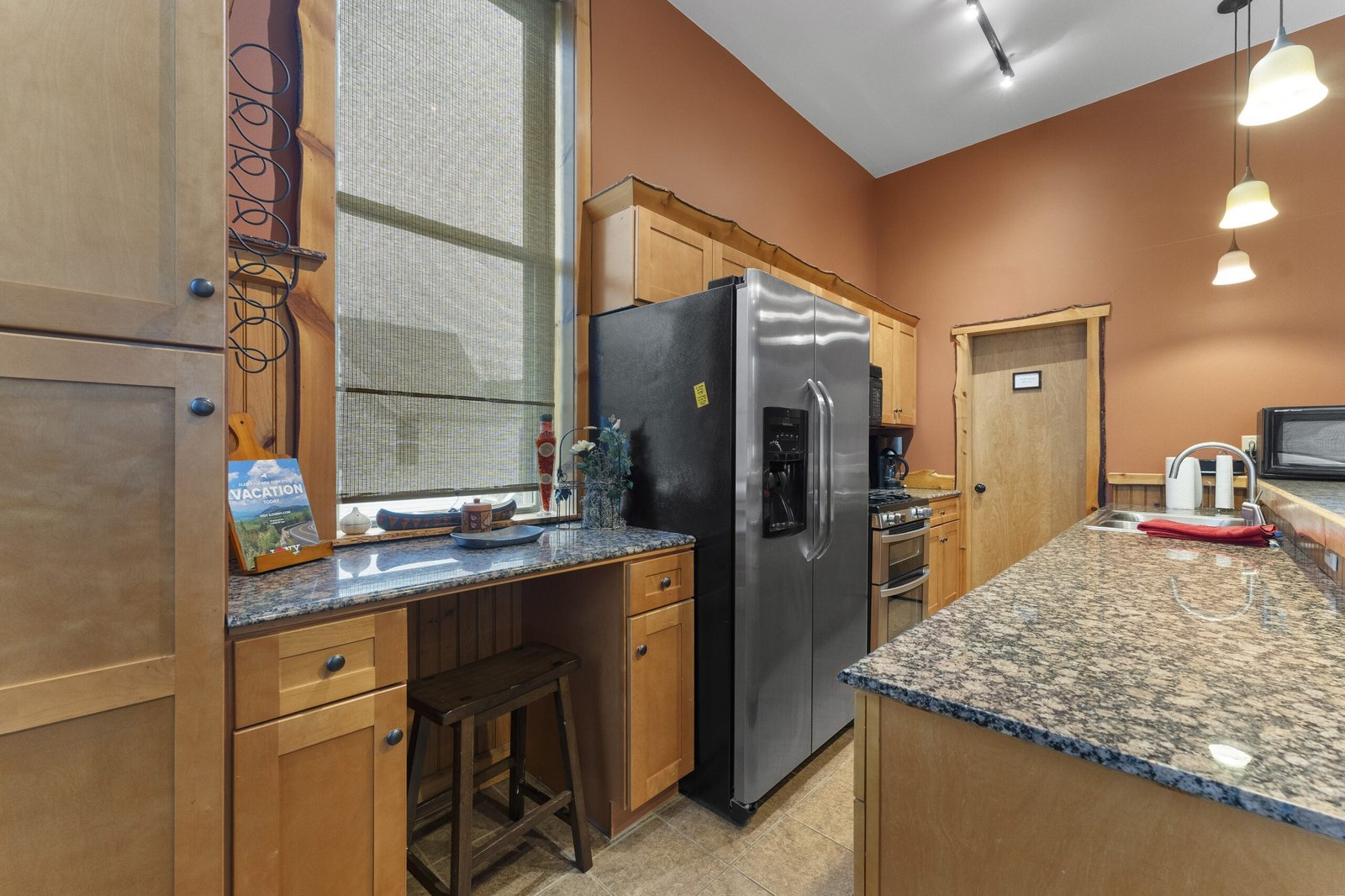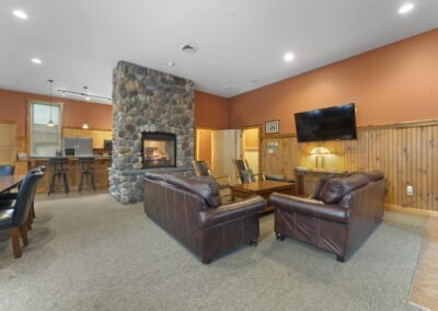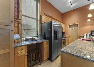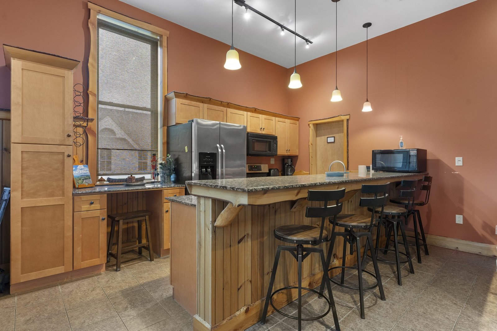 The heart of the loft is the open-concept living area, where you’ll find a double-sided fireplace connecting the living room and dining space, plus a fully equipped chef’s kitchen with granite countertops and stainless steel appliances — ideal for gathering, cooking, and making memories together.