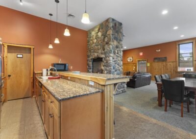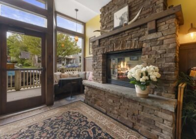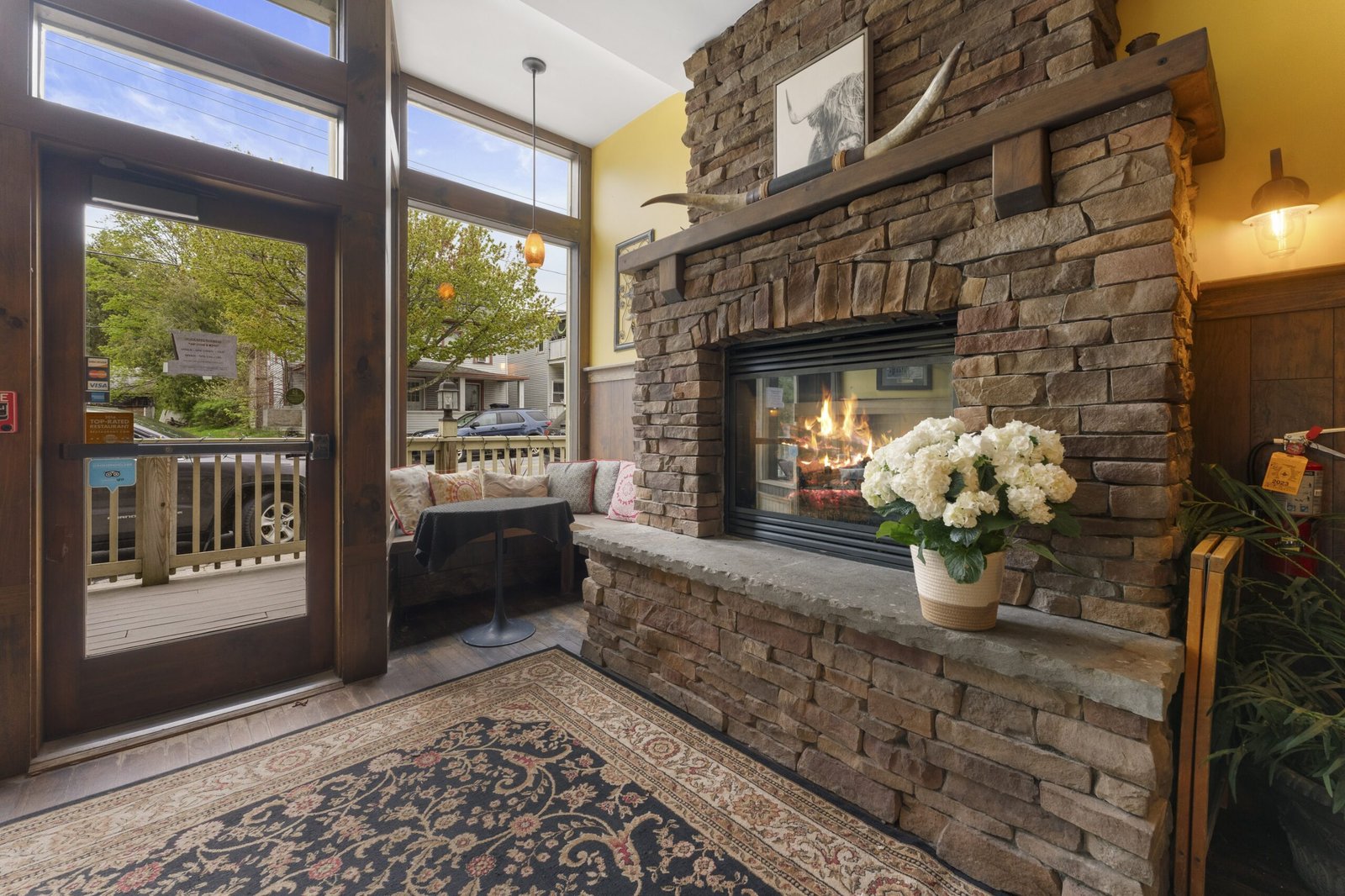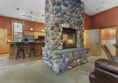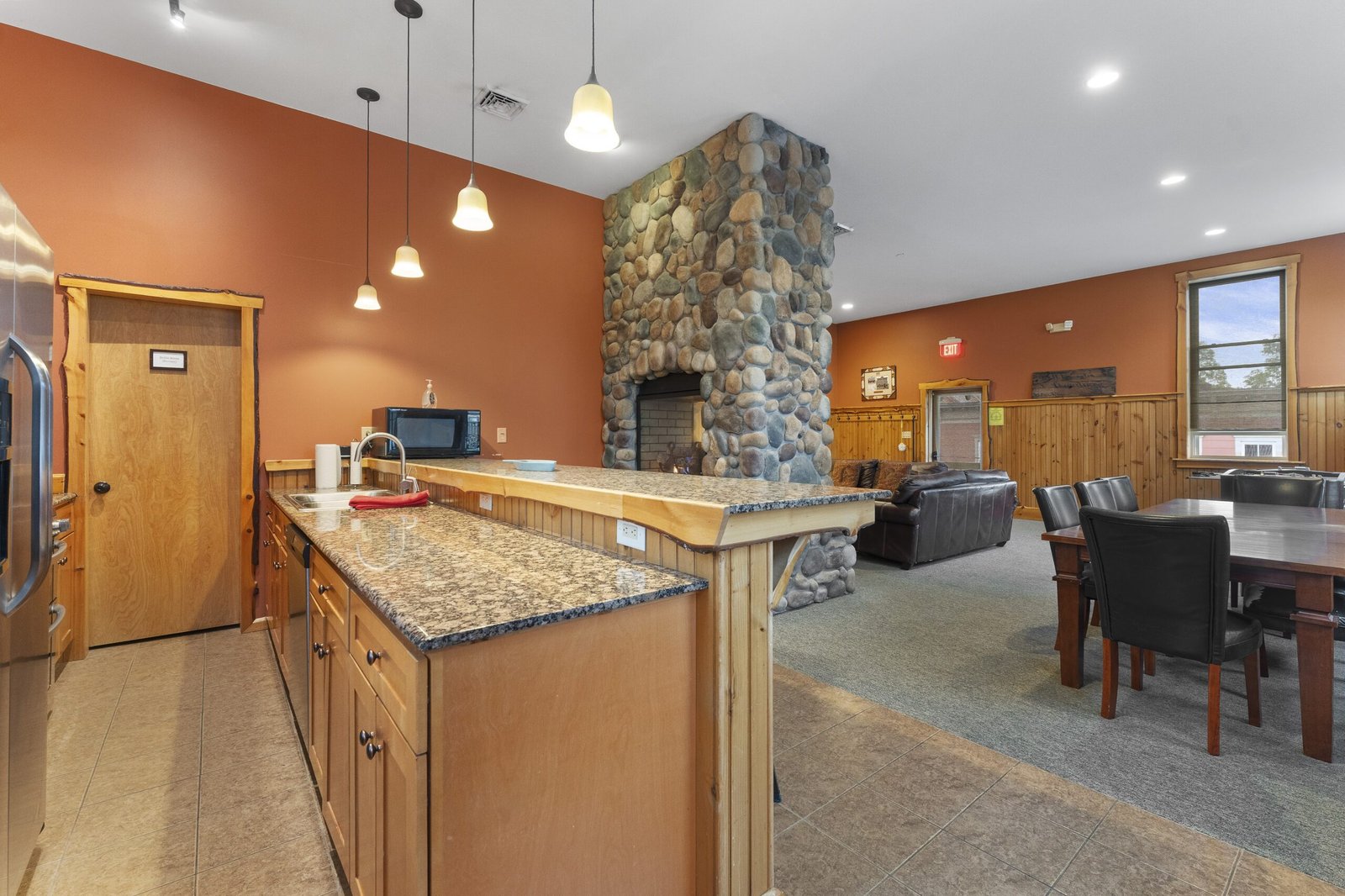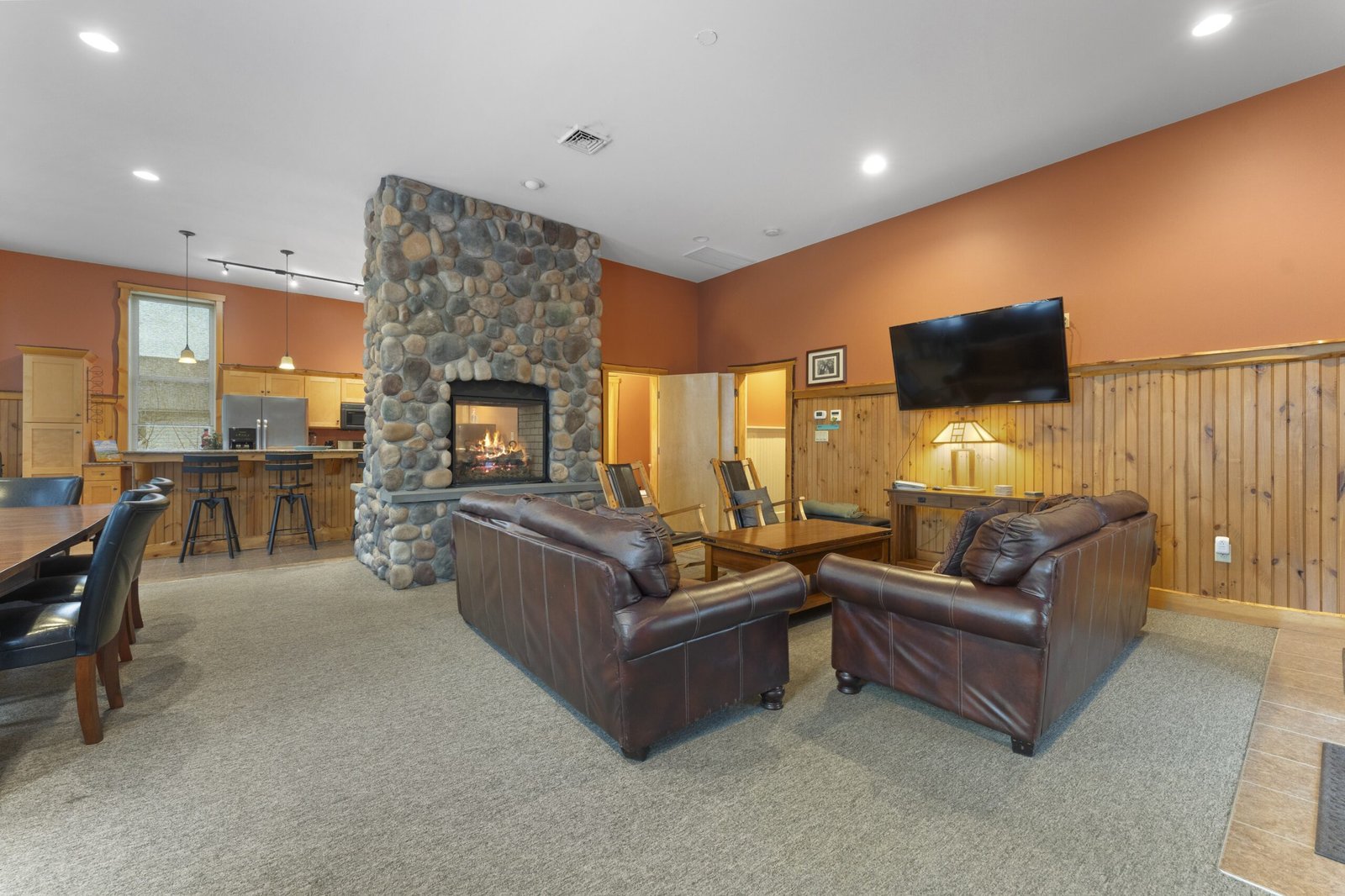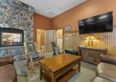 The heart of the loft is the open-concept living area, where you’ll find a double-sided fireplace connecting the living room and dining space, plus a fully equipped chef’s kitchen with granite countertops and stainless steel appliances — ideal for gathering, cooking, and making memories together.